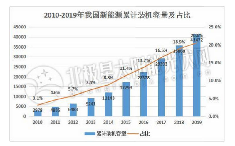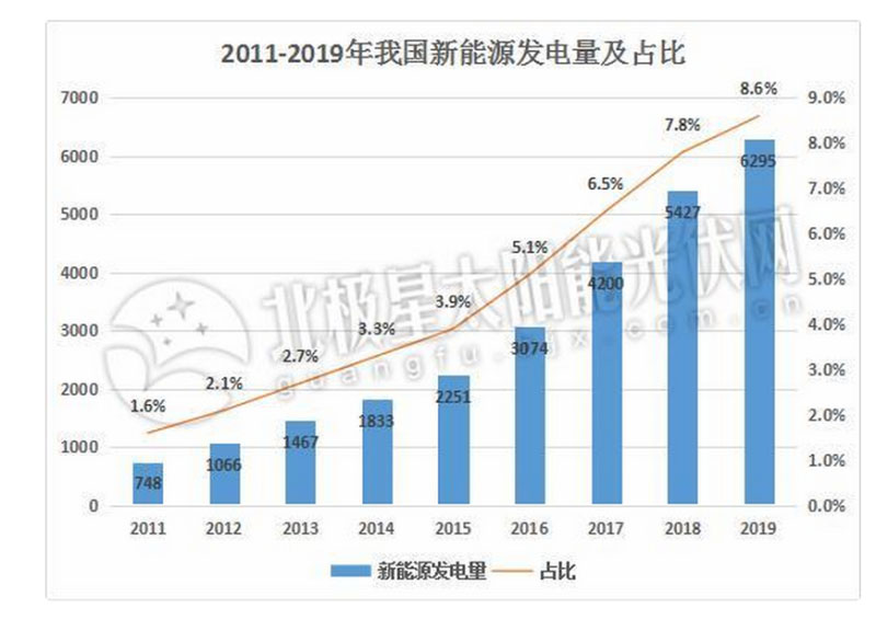 近年來,我國新能源裝機量及發(fā)電量始終保持增長態(tài)勢,新能源發(fā)電量在總發(fā)電量中的占比也逐年提高,統(tǒng)計數(shù)據(jù)顯示,2019年我國新能源發(fā)電量已經(jīng)達到6295億千瓦時,占總發(fā)電量的8.6%。