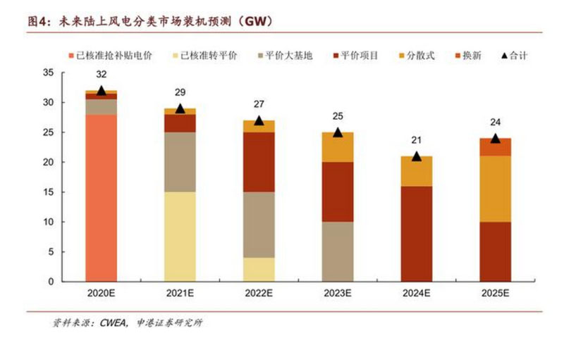 風(fēng)電行業(yè)在2020年將進(jìn)入搶裝高峰期,由于此次搶裝是帶補(bǔ)貼項(xiàng)目和平價(jià)大基地項(xiàng)目共同推進(jìn),并且政策鼓勵(lì)已核準(zhǔn)項(xiàng)目后續(xù)轉(zhuǎn)為平價(jià)項(xiàng)目,無(wú)論從政策制定端還是市場(chǎng)端,均有意將這次搶裝周期平滑,避免2021年后出現(xiàn)的大滑坡。我們認(rèn)為在平價(jià)大基地項(xiàng)目、轉(zhuǎn)平價(jià)項(xiàng)目的支撐下,未來(lái)五年風(fēng)電年新增裝機(jī)量將會(huì)維持在20~30GW之間,2025年累計(jì)裝機(jī)容量將接近400GW。平價(jià)項(xiàng)目成為主流的同時(shí),分散式項(xiàng)目也即將迎來(lái)長(zhǎng)足的發(fā)展。2025年后將陸續(xù)迎來(lái)機(jī)組換新,將會(huì)帶來(lái)新一輪增量。