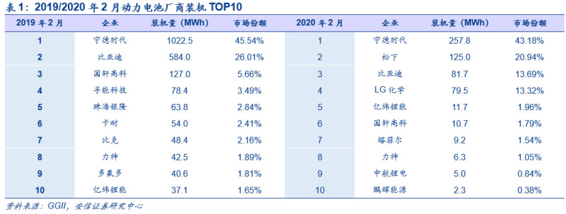 根據(jù)GGII動力電池裝機數(shù)據(jù),2020年2月我國共實現(xiàn)動力電池裝機0.60GWh,同比下滑74%。其中乘用車電池裝機0.52GWh,同比下滑69%;客車裝機0.06GWh,同比下滑87%;專用車裝機0.015GWh,同比下滑91%。電池裝機排名前三廠商分別為寧德時代、松下、比亞迪,其中寧德時代裝機份額達到43%,穩(wěn)定位居高位,但份額有明顯下降。