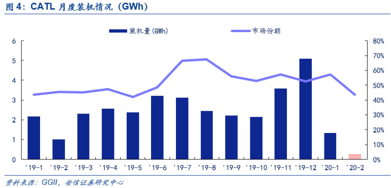 寧德時代裝機份額維持高位,但份額有所下滑。2020年2月,CATL實現(xiàn)動力電池裝機0.26GWh,市場份額43%,同比下降1.88Pcts,環(huán)比下降13.78Pcts。具體從產(chǎn)品類型來看,2020年2月CATL動力電池裝機中,乘用車裝機量占比82%;客車占比16%;專用車占比2%。