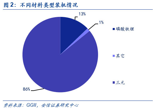分材料類型看:2月三元電池裝機量為5.12GWh,占比86%;磷酸鐵鋰電池裝機量為0.76GWh,占比13%;錳酸鋰、鈦酸鋰等其他電池裝機量為0.014GWh,占比1.4%。和上個月相比,三元的裝機份額大幅度上升,環(huán)比上升21Pcts,和乘用車份額大幅度上漲相關(guān)。
