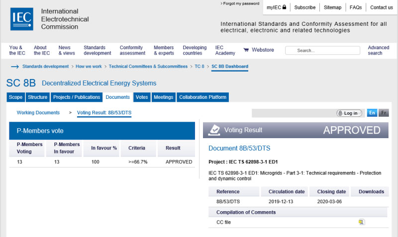 中國(guó)儲(chǔ)能網(wǎng)訊:近日,由新疆金風(fēng)科技股份有限公司(下稱“金風(fēng)科技”)全資子公司北京天誠(chéng)同創(chuàng)電氣有限公司(下稱“天誠(chéng)同創(chuàng)”)提出并牽頭制定的國(guó)際標(biāo)準(zhǔn)《微電網(wǎng) 第3-1部分:技術(shù)規(guī)范-保護(hù)和動(dòng)態(tài)控制》(下稱IEC TS 62898-3-1)獲國(guó)際電工委員會(huì)分布式電力能源系統(tǒng)分技術(shù)委員會(huì)(下稱IEC/SC8B)以100%的贊成票率批準(zhǔn)通過(guò),預(yù)計(jì)將于2020年11月正式發(fā)布。
