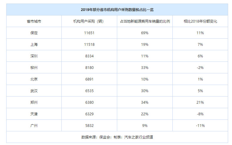 新能源乘用車的大買主除出租租賃平臺之外,還有自用非運(yùn)營的單位用戶為其銷量增長做貢獻(xiàn)。機(jī)動車交強(qiáng)險數(shù)據(jù)顯示,2019年,機(jī)構(gòu)用戶采購新能源乘用車共計15.87萬輛,占比18%,相比2018年提升了2個百分點(diǎn)。分區(qū)域看,部分城市如河北保定的機(jī)構(gòu)用戶是拉動當(dāng)?shù)匦履茉闯擞密囦N量的主力。