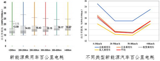 從統(tǒng)計(jì)數(shù)據(jù)可以看出,我國(guó)新能源乘用車百公里電耗總體在10-20kWh區(qū)間,平均電耗為15.1kWh,達(dá)到了國(guó)際先進(jìn)水平。但與公告能耗數(shù)據(jù)相比還有一定差距,其原因主要在于國(guó)家平臺(tái)的數(shù)據(jù)是基于車輛實(shí)際運(yùn)行數(shù)據(jù),把空調(diào)、電氣附件等電耗、都計(jì)算在內(nèi)。具體來(lái)說(shuō),出租車、公務(wù)車、租賃車和私人車輛4種車型中,出租車的平均電耗最高,私人乘用車電耗最低;車速在30-80km/h范圍內(nèi),電耗水平相對(duì)較低。