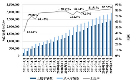 具體來(lái)說(shuō),客車和專用車的上線率相對(duì)比較平穩(wěn),目前均超過(guò)85%;乘用車作為目前新能源汽車推廣的主力, 2019年12月上線率比2018年1月增長(zhǎng)了40%。