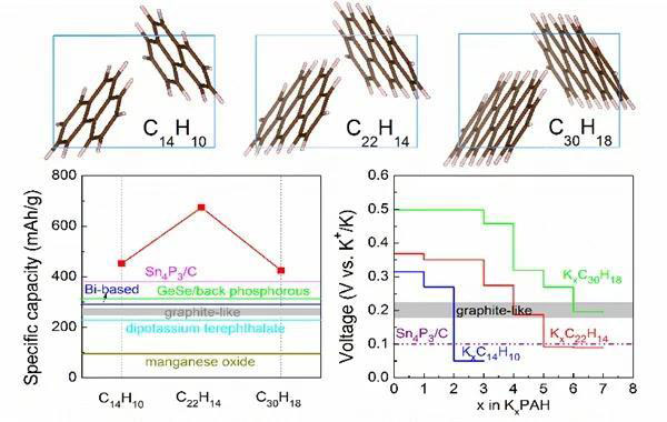 苯乙烯材料(上)在嵌入鉀時(shí)的理論比容量(左下)和開(kāi)路電壓(右下)與其它材料的對(duì)比