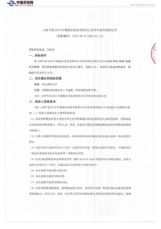 ,3月24日,上海平高發(fā)布2019年儲(chǔ)能站設(shè)備采購項(xiàng)目競爭性談判采購公告,本次招標(biāo)共分為1個(gè)標(biāo)段,公告顯示采購設(shè)備包含儲(chǔ)能電池、電池管理系統(tǒng)BMS、預(yù)制艙、儲(chǔ)能變流器PCS、升壓變、匯流柜等。