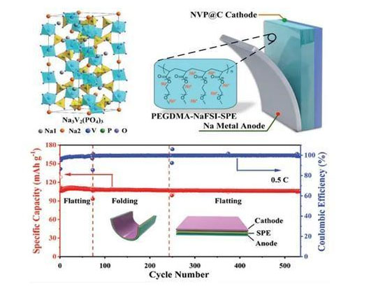 該團(tuán)隊(duì)一方面設(shè)計(jì)并發(fā)展了光固化聚合法,制備出了一種新型聚合物固態(tài)電解質(zhì),所得電解質(zhì)在室溫下的離子電導(dǎo)率高達(dá)10-4S/cm,且具有極好的柔韌性;另一方面,利用溶膠凝膠法制備了薄層碳(5納米)修飾的磷酸釩鈉正極材料,提高了材料的電子、離子和電荷的傳輸效率。在此基礎(chǔ)上,該團(tuán)隊(duì)構(gòu)筑了聚合物電解質(zhì)/電極材料一體化的集成系統(tǒng),有效加強(qiáng)了固固界面接觸,降低了電池界面阻抗,研制出了高比能、長(zhǎng)壽命的柔性固態(tài)鈉離子電池。