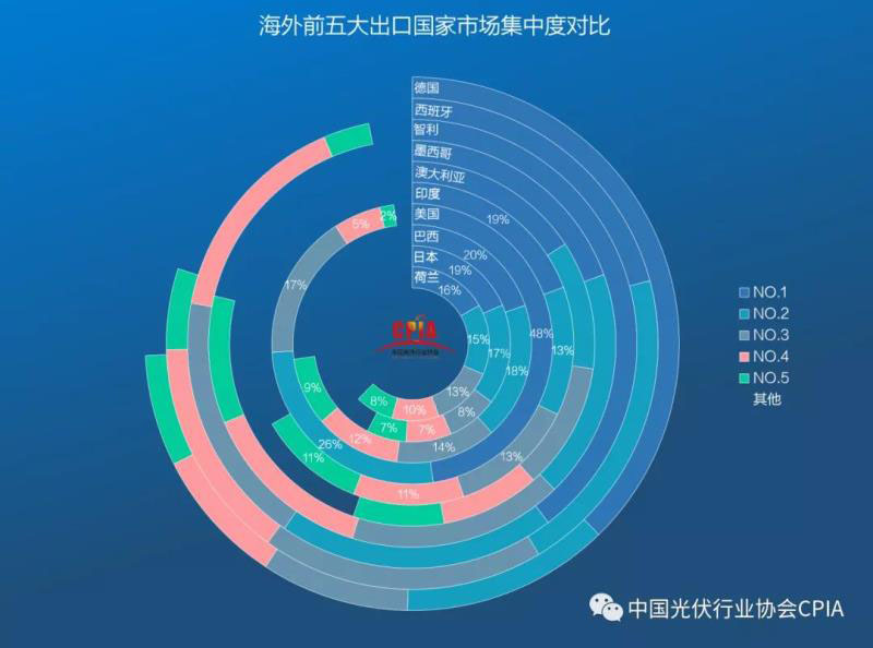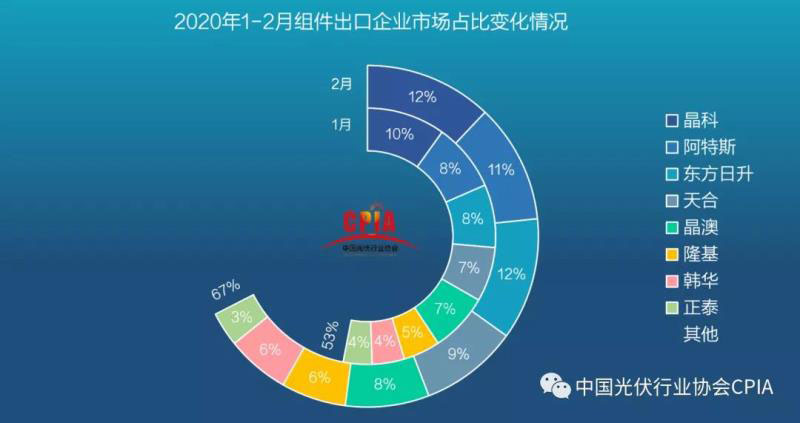2020年1-2月,海外前五大和前十大組件出口市場(chǎng)占比分別為51%和73%,同比2019年分別下降了3.6個(gè)百分點(diǎn)與2.7個(gè)百分點(diǎn)(2019年1-2月TOP5-54.6%,TOP10-75.7%),海外市場(chǎng)繼續(xù)呈現(xiàn)多元化發(fā)展趨勢(shì)。