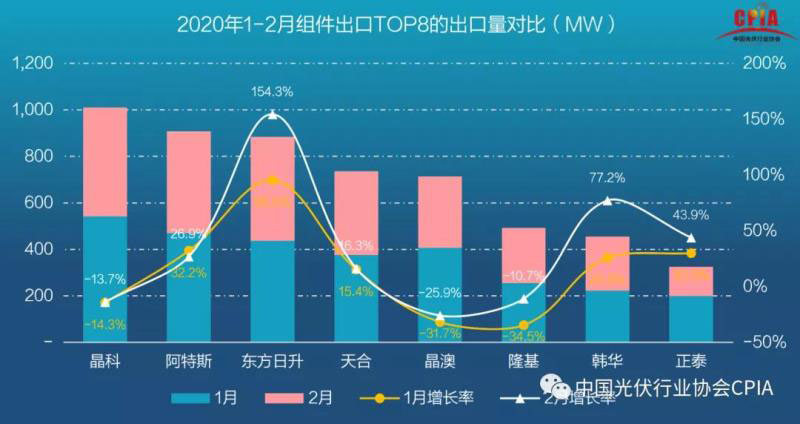 【美國(guó)】1-2月組件出口規(guī)模已超400MW,而2019年全年的出口規(guī)模僅260MW左右?;仡?019年的美國(guó)市場(chǎng),2019年美國(guó)光伏市場(chǎng)新增裝機(jī)13.3GW,同比增長(zhǎng)23%。近期,美國(guó)能源部的能源信息管理局(EIA)發(fā)布了對(duì)2020年美國(guó)太陽(yáng)能市場(chǎng)的裝機(jī)預(yù)測(cè):到2020年,美國(guó)將安裝13.4 GW的公用事業(yè)規(guī)模的太陽(yáng)能和5.1GW的小型太陽(yáng)能,將較2019年再增加95%。組件進(jìn)口方面,2019年上半年,馬來(lái)西亞、越南、韓國(guó)和泰國(guó)占美國(guó)光伏組件進(jìn)口量的近85%??傆?jì)93%的進(jìn)口來(lái)自亞洲國(guó)家,只有1%來(lái)自中國(guó)。貿(mào)易壁壘方面,進(jìn)口雙面組件的201關(guān)稅在2019年6月宣布豁免,沒過多久在10月份又宣布取消了雙面組件的關(guān)稅豁免,但12月再次宣布豁免201關(guān)稅。雖然美國(guó)制造商可以在6個(gè)月內(nèi)將單面電池和組件生產(chǎn)線轉(zhuǎn)換為雙面生產(chǎn)線,但考慮到雙面組件已豁免并可以從中國(guó)進(jìn)口,因此不會(huì)選擇產(chǎn)線轉(zhuǎn)換,如此一來(lái)美國(guó)雙面組件顯然供應(yīng)不足,仍然需要大量進(jìn)口。所以今年我國(guó)出口美國(guó)的組件中基本都會(huì)是雙面組件。然短期內(nèi)面臨的是美國(guó)疫情持續(xù)惡化,恐不利于新訂單的促成。1-2月該地區(qū)組件市場(chǎng)出口額占比前五的企業(yè)分別為東方日升(47.6%)晶科(26.4%)、正泰(16.8%)、晶澳(5.4%)、天合(1.6%)。