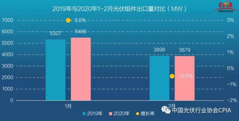 2020年1月組件出口規(guī)模5486MW,同比上升3.0%;2月組件出口規(guī)模3879MW,同比下降0.5%,總體來(lái)看1-2月組件出口規(guī)模同去年基本持平。但從出口增速環(huán)比情況來(lái)看,2019年2月組件出口3898MW,環(huán)比下降26.8%;2020年2月電池片出口3879MW,環(huán)比下降29.3%,相比2019年2月出口環(huán)比增速僅回落了2.5個(gè)百分點(diǎn),較電池片環(huán)節(jié)回落幅度明顯偏小。疫情對(duì)2月組件出口的影響不是很強(qiáng),隨著海外疫情的加劇,港口清關(guān)以及檢疫時(shí)間延長(zhǎng),疊加疫情嚴(yán)重地區(qū)可能會(huì)出現(xiàn)海外項(xiàng)目延期等因素,預(yù)計(jì)疫情的影響在3月的出口情況中會(huì)體現(xiàn)的更加明顯。