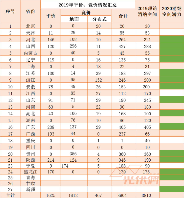 備注:2019年理論消納空間綜合國(guó)網(wǎng)、南網(wǎng)相關(guān)報(bào)告,供參考;標(biāo)注綠色的為2020年消納空間接近或有望超過(guò)1GW的省份。