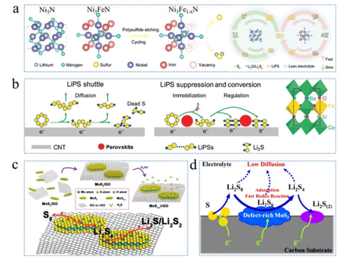 在充放電過程中,缺陷的引入不僅可以增強(qiáng)對(duì)多硫化物的吸附,而且可以作為電催化劑顯著加速硫的氧化還原反應(yīng)。研究表明,電極材料中的空位缺陷可以調(diào)控電子結(jié)構(gòu),使其具有良好的物理和電化學(xué)性能,從而影響電荷轉(zhuǎn)移和離子擴(kuò)散和吸附。陽(yáng)離子空位作為一種典型的缺陷,已被報(bào)道可作為強(qiáng)吸附多硫化物的場(chǎng)所。除了金屬氧化物的陽(yáng)離子空位外、陰離子空位也可以作為捕獲多硫化物并顯著改善其氧化還原反應(yīng)的活性位點(diǎn)。