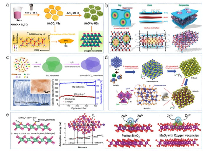 另外,過渡金屬氧化物(TMOs)作為金屬離子電池常見的負(fù)極材料,具有理論容量大、價(jià)格低廉等優(yōu)點(diǎn),近年來(lái)引起了廣泛的關(guān)注。在這些材料中,倍率、容量和循環(huán)穩(wěn)定性往往受到離子擴(kuò)散差和電荷轉(zhuǎn)移慢的限制。在過渡金屬氧化物中,氧空位缺陷是目前最常見的陰離子缺陷,其形成能較低而且易于形成。氧空位的存在可有效地調(diào)控過渡金屬氧化物的表面電子結(jié)構(gòu)和物理化學(xué)性質(zhì),因此起著至關(guān)重要的作用。在二次電池中,氧空位缺陷的形成能夠誘導(dǎo)金屬氧化物中的電子結(jié)構(gòu)發(fā)生變化,從而影響電子和離子的傳輸。并且在電極/電解液界面處,氧空位的存在不僅可以通過改變表面熱力學(xué)來(lái)促進(jìn)鋰化過程中的相變,而且可以很好地保持電極表面形貌的完整性,從而改善材料在充放電過程中的倍率性能和循環(huán)性能。例如,已經(jīng)有研究表明,具有氧空位缺陷的二氧化鈦、二氧化錫、氧化錳等氧化物作為鋰離子電池負(fù)極材料可以有效地提高電池的循環(huán)穩(wěn)定性以及倍率性能,從而提升電池的電化學(xué)性能。