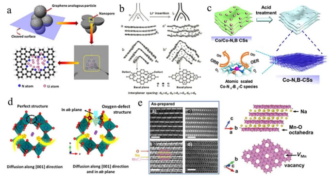 以鋰離子電池為例,當(dāng)充電時(shí),鋰離子從正極脫出,通過電解液嵌入負(fù)極,而放電過程則相反。因此,電池的容量直接取決于活性物質(zhì)和金屬離子的儲(chǔ)存位點(diǎn)數(shù)量。在負(fù)極材料中,具有良好穩(wěn)定性和低成本的碳基材料得到了廣泛的研究。由于其具有層狀結(jié)構(gòu),可以提供金屬離子快速傳輸?shù)耐ǖ?,在循環(huán)過程中能夠保持結(jié)構(gòu)的完整性,在充放電過程中體積膨脹小,因此具有良好的倍率和循環(huán)性能。但是,由于金屬離子的存儲(chǔ)位置有限,擴(kuò)散動(dòng)力學(xué)較差,使得材料的理論容量相對(duì)較低。近年來(lái)的許多研究表明,在碳材料中構(gòu)筑缺陷可以提供更多的活性位點(diǎn)和離子存儲(chǔ)位點(diǎn),多余的金屬原子可以容納在缺陷結(jié)構(gòu)中,從而提供更多的額外容量。