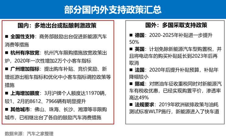 其次,政策扶持力度或進(jìn)一步加大,由普惠型走向精準(zhǔn)型。短期內(nèi)為彌補(bǔ)疫情帶來(lái)的影響,多地已出臺(tái)或醞釀出臺(tái)相關(guān)刺激政策鼓勵(lì)新能源汽車消費(fèi)。據(jù)統(tǒng)計(jì),現(xiàn)有杭州、廣州、上海、佛山等七地已相繼推出相關(guān)政策,放寬限購(gòu)指標(biāo)、鼓勵(lì)汽車消費(fèi)。其他多城市正在醞釀中,有望跟進(jìn)。放眼海外,隨著2019年歐洲碳排放政策與油耗測(cè)試標(biāo)準(zhǔn)WLTP的施行,歐洲新能源汽車發(fā)展進(jìn)入快車道。德、英、法等國(guó)均推出支持政策鼓勵(lì)新能源汽車行業(yè)發(fā)展。我國(guó)未來(lái)政策制定也必將參考國(guó)外同行業(yè)的措施進(jìn)行完善。