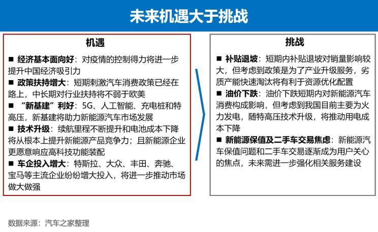 新能源市場(chǎng)處于發(fā)展轉(zhuǎn)型期,雖然經(jīng)歷了短期調(diào)整的陣痛(將在之后幾年持續(xù)調(diào)整)以及突發(fā)事件的打擊,但國(guó)家對(duì)新能源汽車行業(yè)的看好依然不會(huì)改變,也必將為產(chǎn)業(yè)發(fā)展保駕護(hù)航。從中長(zhǎng)期發(fā)展來(lái)看,未來(lái)機(jī)遇大于挑戰(zhàn)。