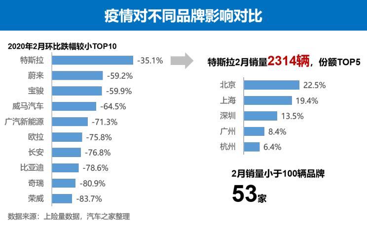 但疫情的爆發(fā)同時(shí)也將加速市場(chǎng)優(yōu)勝劣汰進(jìn)程,抗壓能力強(qiáng)的品牌或在疫情過(guò)后的市場(chǎng)表現(xiàn)中脫穎而出。2月特斯拉表現(xiàn)突出,銷量為2314輛,較1月份僅萎縮35.1%。而與之形成鮮明對(duì)比的是,2月份銷量小于100輛的新能源品牌有53家。疫情的影響或?qū)⒓铀俾浜螽a(chǎn)能的消亡,實(shí)現(xiàn)市場(chǎng)資源配置優(yōu)化。