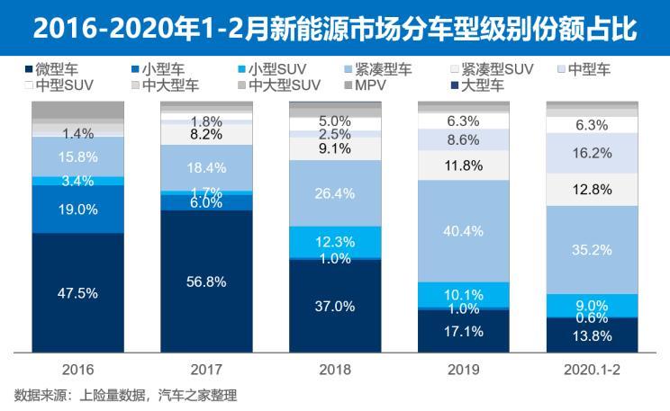 其次,產(chǎn)品結(jié)構(gòu)升級(jí),由小/微型級(jí)別產(chǎn)品為主轉(zhuǎn)向主流級(jí)別為主。從近年來(lái)新能源車型級(jí)別份額變化觀察,在2016年占據(jù)市場(chǎng)最大份額(47.5%)的是微型車,其次是小型車(19.0%)。進(jìn)入2019年,微型車市場(chǎng)份額已下降到17.1%,市場(chǎng)份額最大級(jí)別變?yōu)榫o湊型車(40.4%)。在燃油車市場(chǎng)中的主力級(jí)別,緊湊型SUV、小型SUV等份額均有提升。疫情的到來(lái)進(jìn)一步加速產(chǎn)品結(jié)構(gòu)轉(zhuǎn)型,尤其是中型車市場(chǎng)的崛起。