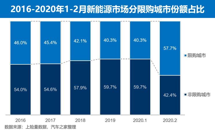 首先,需求導(dǎo)向轉(zhuǎn)變,由政策導(dǎo)向?yàn)橹鬓D(zhuǎn)向市場(chǎng)導(dǎo)向?yàn)橹鳌S?016-2020年1-2月新能源市場(chǎng)分限購(gòu)城市份額變化可以看出,2019年非限購(gòu)城市份額已上升到59.7%,較2015年上升約6個(gè)百分點(diǎn)。雖然受疫情影響短期內(nèi)自然需求有所降低,但中長(zhǎng)期趨勢(shì)不改。另外,疫情的沖擊使得限購(gòu)城市份額增高;因此針對(duì)疫情的短期刺激政策也必將由限購(gòu)城市發(fā)起。