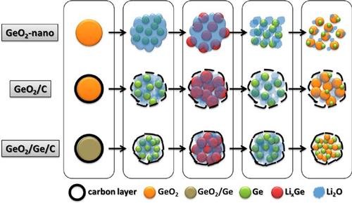 上圖為不同材料的鋰化反應機制的示意圖。其中GeO2在GeO2-nano,GeO2/C以及GeO2/Ge/C中可逆反應機制如圖所示。GeO2 納米結(jié)構(gòu)是轉(zhuǎn)換反應的必要條件,而碳涂層可提高轉(zhuǎn)換反應的可逆性,GeO2/Ge/C中Ge元素粒子對于提高GeO2轉(zhuǎn)換反應可逆性起到了至關(guān)重要的作用。