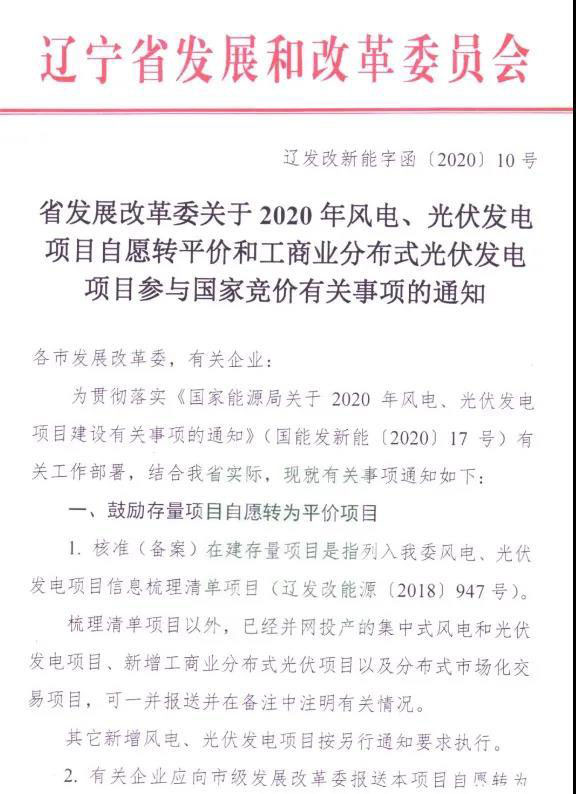 近日,遼寧省發(fā)改委發(fā)布《關(guān)于2020年全省風(fēng)電、光伏有關(guān)事項通知》,主要內(nèi)容有兩條:鼓勵存量項目自愿轉(zhuǎn)為平價項目、支持工商業(yè)分布式光伏發(fā)電項目參與國家競價!
