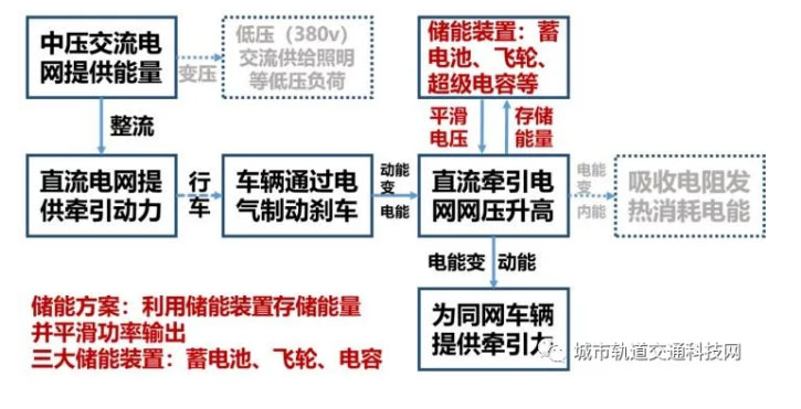 事實(shí)上,目前使用的儲(chǔ)能技術(shù)方案,比起單純地把站臺(tái)修高則要復(fù)雜和有效得多,為地鐵系統(tǒng)節(jié)能降耗提供了更多的調(diào)度和使用的靈活性,其能量流轉(zhuǎn)過(guò)程如下圖所示,儲(chǔ)能的代表技術(shù)主要有蓄電池儲(chǔ)能、電容儲(chǔ)能、飛輪儲(chǔ)能3種。