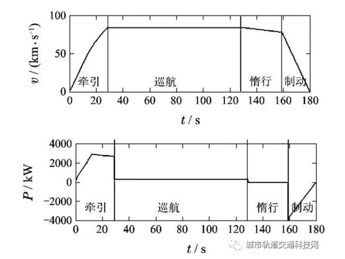 如上圖所示,車輛在站間運(yùn)行時(shí),先經(jīng)歷牽引階段,車輛由靜止開始加速,電機(jī)消耗較大的功率產(chǎn)生牽引力,車速加速至80km/h左右。之后,車輛進(jìn)入等速巡航階段,此時(shí)電網(wǎng)只需要提供較小的功率即可維持車輛的巡航,車輛快到站的時(shí)候,電網(wǎng)不再提供功率,車輛開始惰行,車速稍有降低,最后車輛進(jìn)入制動(dòng)階段,車速迅速減至0。