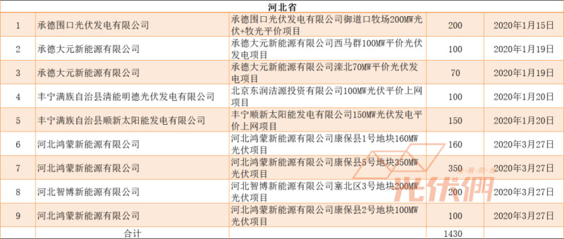 此外,根據(jù)光伏們的統(tǒng)計(jì),2020年以來,河北光伏新增備案約1.43GW,均位于張家口、承德市,詳情如下: