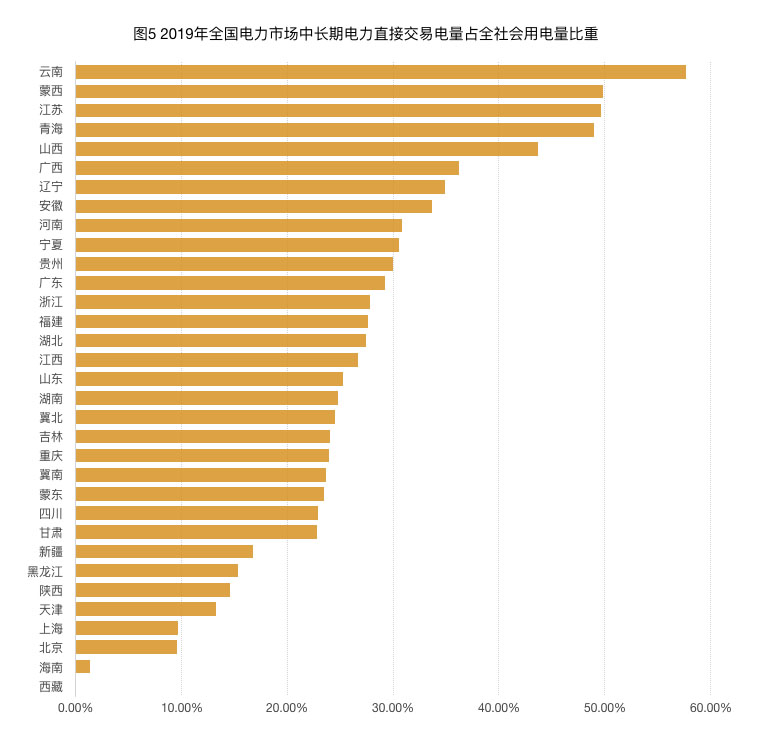 如圖5所示,從中長期電力直接交易電量占全社會用電比重來看,云南最高,所占比重為57.7%。蒙西、江蘇和青海所占比重接近50%。