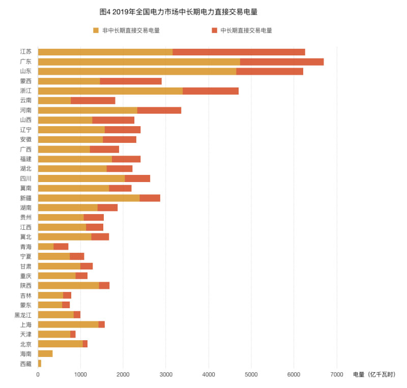 如圖4所示,從2019年中長期電力直接交易電量規(guī)模來看,江蘇、廣東和山東分別位列前三位,而廣東、山東的非中長期直接交易電量遠高于江蘇。