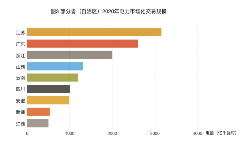 截至目前,部分?。ㄗ灾螀^(qū)、市)公布了2020年電力市場化交易規(guī)模,如圖3所示,其中江蘇、廣東和浙江分別以3150億千瓦時、2600億千瓦時和2000億千瓦時位列前三。