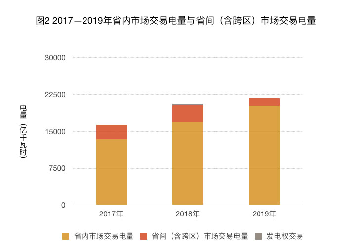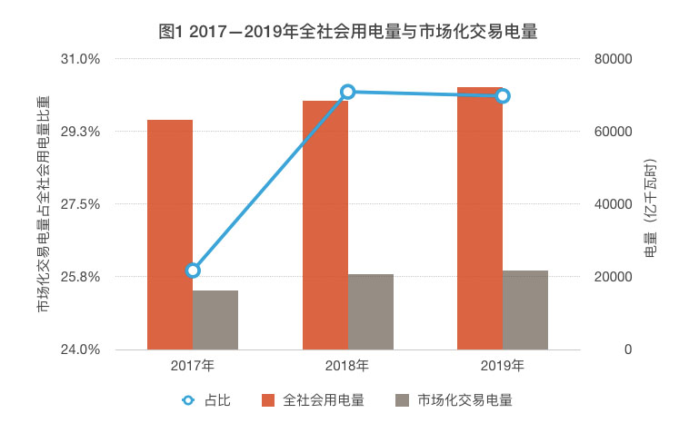 如圖1所示,2017年—2019年,全國市場化交易電量規(guī)模逐年擴大,但市場化交易電量占全社會用電量的比重有所下降。2019年,市場化交易電量占全社會用電量比重達到30.1%,但相比2018年下降了0.1%。