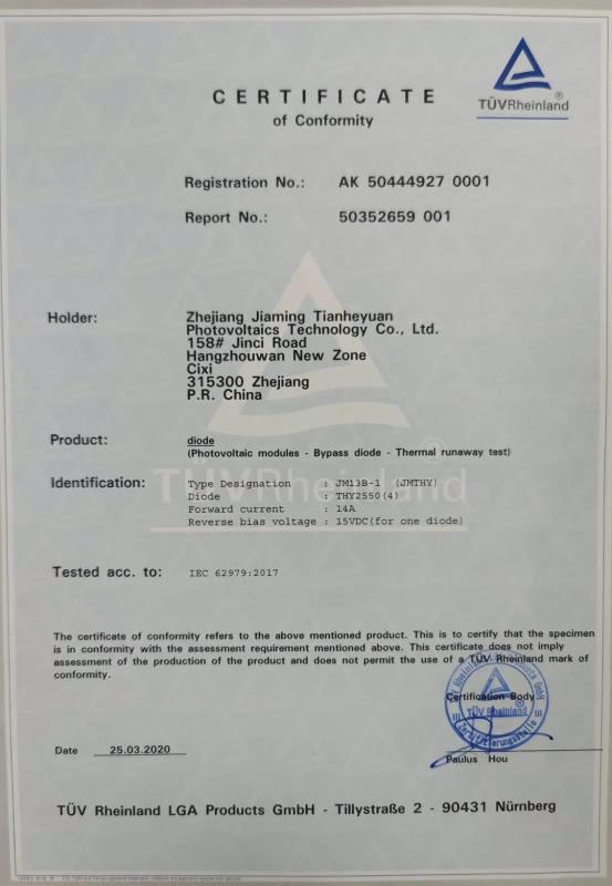 浙江佳明天和緣光伏科技有限公司的該款接線盒通過本次測(cè)試,達(dá)到了二極管正向電流14A,反向偏壓15Vd.c. (單顆極管)。