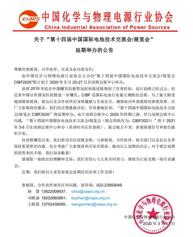 雖然2019年底在中國爆發(fā)的新型冠狀病毒疫情得到了有效控制,流行高峰已經(jīng)過去,但近來中國以外國家的疫情進(jìn)一步爆發(fā)。CIBF是國際電池行業(yè)最大規(guī)模的會展,為了最大限度地保障參展商、觀眾以及合作伙伴的身體健康與生命安全,確保海內(nèi)外參展商的參展效果,應(yīng)廣大參展商的要求,我們經(jīng)過慎重地評估,并鄭重地宣布:“第十四屆中國國際電池技術(shù)交流會/展覽會CIBF2020”將延期舉辦。由于深圳會展中心2020年檔期已滿,經(jīng)與深圳會展中心溝通,“第十四屆中國國際電池技術(shù)交流會/展覽會(展會簡稱改為:CIBF2021)”將于2021年3-5月在深圳會展中心舉辦(具體時間正在協(xié)商),展會地點不變、參展商展位號和展位面積不變。