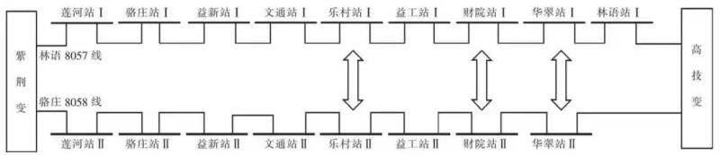 方案26 對應(yīng)的林語8057 線-駱莊8058 線的母線優(yōu)化與間隔優(yōu)化方案,需要調(diào)整的母線如圖7 所示,具體包括:林語8057 線的樂村站Ⅰ、財院站Ⅰ、華翠站Ⅰ換至駱莊8058 線;駱莊8058線的樂村站Ⅱ、財院站Ⅱ、華翠站Ⅱ改接至林語8057 線。需要調(diào)整的益新站間隔接線為:益新站Ⅰ的益南五分線換至益新站Ⅱ;益新站Ⅱ的益南三分線、益南六分線改接至益新站Ⅰ。