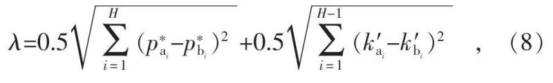 式中:a,b 為兩個母線負(fù)荷族群中心;H 為數(shù)據(jù)點個數(shù);pagenumber_ebook=17,pagenumber_book=13為a 負(fù)荷族群中心的第i 個均一化后的負(fù)荷值;pagenumber_ebook=17,pagenumber_book=13為b 負(fù)荷族群中心的第i 個均一化后的負(fù)荷值;pagenumber_ebook=17,pagenumber_book=13為a 負(fù)荷族群中心的第i 個功率變化率值;pagenumber_ebook=17,pagenumber_book=13為b 負(fù)荷族群中心的第i 個功率變化率值。λ 值越大,兩個負(fù)荷族群中心在負(fù)荷水平與形態(tài)特征上的差異越大,其族群互補(bǔ)性越強(qiáng)。