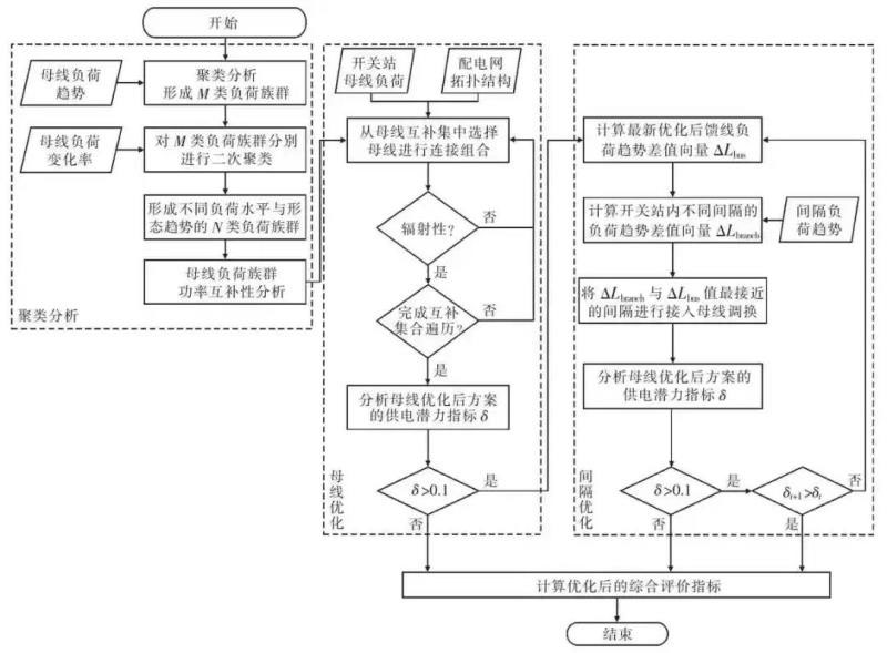 由于實際操作過程中,母線調(diào)整的實施工作量少于間隔調(diào)整的實施工作量,因此優(yōu)先對配網(wǎng)線路上的母線進(jìn)行優(yōu)化重組,若母線優(yōu)化后,線路仍具有較大的供電能力挖潛空間,則進(jìn)一步實施間隔優(yōu)化布點,最終實現(xiàn)線路負(fù)荷降峰值、平波動以及錯峰互補(bǔ)的效果。