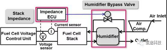 本田CLARITY燃料電池系統(tǒng)的陰極回路具有加濕器,并與旁通閥并聯(lián)。基于CCM含水量和電堆阻抗的關(guān)系特性,依據(jù)測得的電堆阻抗,調(diào)節(jié)旁通閥開度,定量地控制進(jìn)堆氣體濕度,確保電堆CCM含水量控制在最佳運(yùn)行濕度的上限和下限內(nèi),從而令堆內(nèi)濕度維持在適宜的水平。