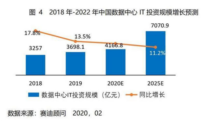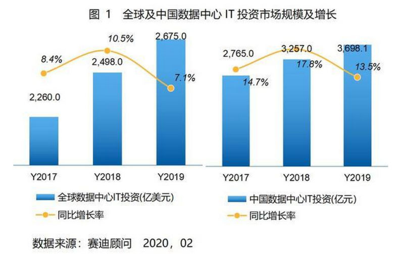 云計(jì)算、大數(shù)據(jù)、物聯(lián)網(wǎng)、人工智能等新一代信息技術(shù)快速發(fā)展,數(shù)據(jù)呈現(xiàn)爆炸式增長(zhǎng),數(shù)據(jù)中心建設(shè)成為大勢(shì)所趨。世界主要國(guó)家和企業(yè)紛紛開啟數(shù)字化轉(zhuǎn)型之路,在這一熱潮推動(dòng)下,全球數(shù)據(jù)中心IT投資呈現(xiàn)快速增長(zhǎng)趨勢(shì)。全球及中國(guó)數(shù)據(jù)中心IT投資規(guī)模增長(zhǎng)率均高于全球GDP增長(zhǎng)率(2.3%)和中國(guó)GDP增長(zhǎng)率(6.1%)。