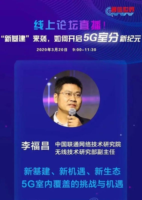 5G時(shí)代,將有超過85%的業(yè)務(wù)將發(fā)生在室內(nèi)場景,因此完善的5G室內(nèi)覆蓋顯得尤為重要。在此背景下,通信世界全媒體特策劃5G室分專題線上研討會(huì),中國聯(lián)通網(wǎng)絡(luò)技術(shù)研究院無線研究部副主任李福昌應(yīng)邀出席沙龍并分享了自己在5G室內(nèi)覆蓋領(lǐng)域的經(jīng)驗(yàn)和思考。在李福昌看來,“新基建”給5G室分帶來了新的機(jī)遇,也為5G室分新生態(tài)提供了萌發(fā)的沃土。