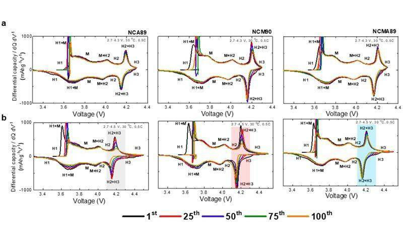 通過對NCMA89、NCA89、NCM90三類電池進(jìn)行100次的充放電循環(huán)測試,Un-Hyuck Kim團(tuán)隊(duì)發(fā)現(xiàn),只有NCMA89的H2-H3不可逆相變的電壓幾乎維持在了初始的狀態(tài),而NCM90與NCA89電池的H2-H3不可逆相變的電壓均出現(xiàn)了不同程度的下滑,氧化還原峰下降。