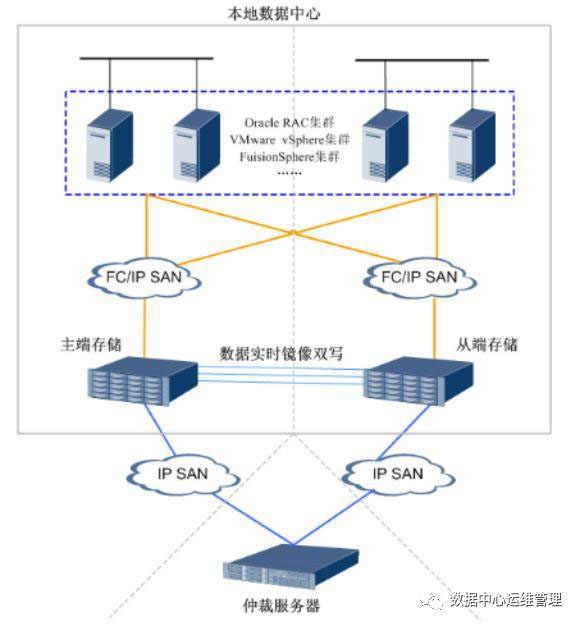 我行生產(chǎn)類業(yè)務(wù)系統(tǒng)均部署于全冗余架構(gòu)的共享存儲中,存儲平臺使用陣列雙活架構(gòu),兩臺高端存儲同時通過FC SAN網(wǎng)絡(luò)向上層主機集群提供業(yè)務(wù)訪問,兩臺存儲之間進(jìn)行實時數(shù)據(jù)同步。當(dāng)出現(xiàn)設(shè)備、鏈路等因素導(dǎo)致其中一臺存儲不可被訪問,存儲底層進(jìn)行故障切換而不會停止數(shù)據(jù)讀寫,主機上層對底層的故障切換無感知,業(yè)務(wù)不中斷,真正做到了RTO和RPO都為零的本地高可靠容災(zāi)。
