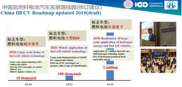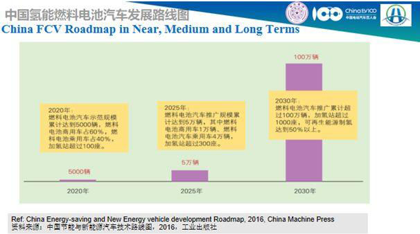 王賀武的解釋是路線圖分為近、中、遠(yuǎn)三期:近期到2020年時(shí),中國將運(yùn)行5,000輛FCV(實(shí)際已經(jīng)超過6000輛),并在高效制氫、儲(chǔ)存、運(yùn)輸、分配以及加氫站等技術(shù)上有突破;中期目標(biāo)是在2025年時(shí),實(shí)現(xiàn)10000輛商用車和40000輛乘用車的運(yùn)行;而遠(yuǎn)期目標(biāo)是到2030年時(shí),完成100萬輛FCV的運(yùn)行,其氫氣來源50%將來自于可再生能源制氫,此外還將運(yùn)營超過1000個(gè)加氫站,以保障氫能燃料電池汽車的正常行駛。
