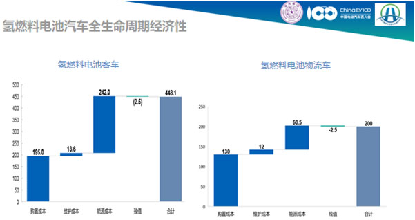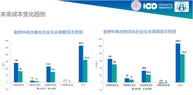 目前,氫燃料電池大巴和物流車的總擁有成本分別為448.1萬元人民幣、200萬元人民幣。隨著產(chǎn)業(yè)不斷發(fā)展,供應(yīng)鏈不斷擴(kuò)大,成本將不斷降低,預(yù)計(jì)2025年時(shí)氫燃料電池大巴和物流車的總擁有成本分別降低到264.4萬元人民幣、107.5萬元人民幣,而到2030年時(shí)氫燃料電池大巴和物流車總擁有成本分別可以達(dá)到161.6萬元人民幣、77.6元人民幣。