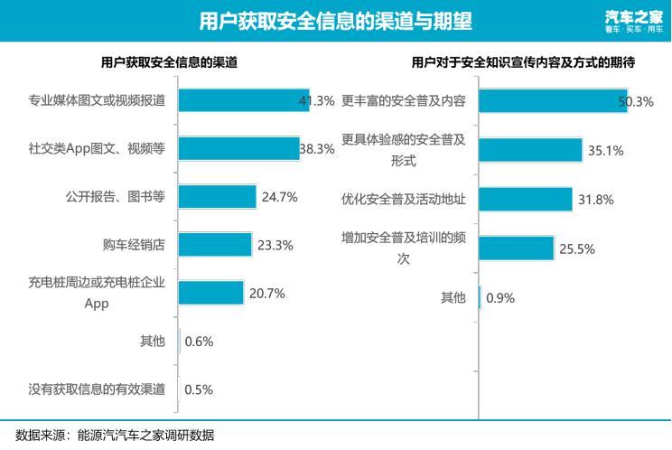從用戶對(duì)于電動(dòng)車安全普及的內(nèi)容與形式的期待來看,超過5成用戶期待更豐富的安全普及內(nèi)容,可見多維度安全信息對(duì)于用戶的重要性。此外,超過30%的用戶期望更具體驗(yàn)感的安全普及形式以及優(yōu)化安全普及活動(dòng)地址,如現(xiàn)場(chǎng)活動(dòng)、店內(nèi)講解、廠商參觀等形式。為用戶提供覆蓋購車、用車全階段,涵蓋安全用車行為、日常安全維護(hù)、安全故障處理等多維信息的內(nèi)容,有利于幫助用戶對(duì)電動(dòng)車的使用與安全建立更深的認(rèn)知,規(guī)范用車行為,消除安全焦慮。