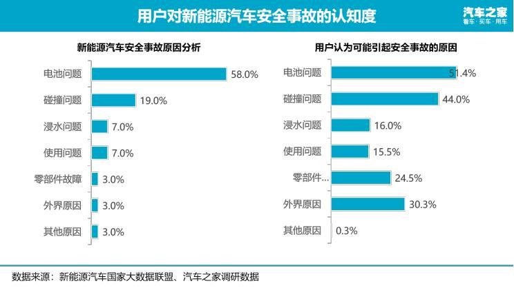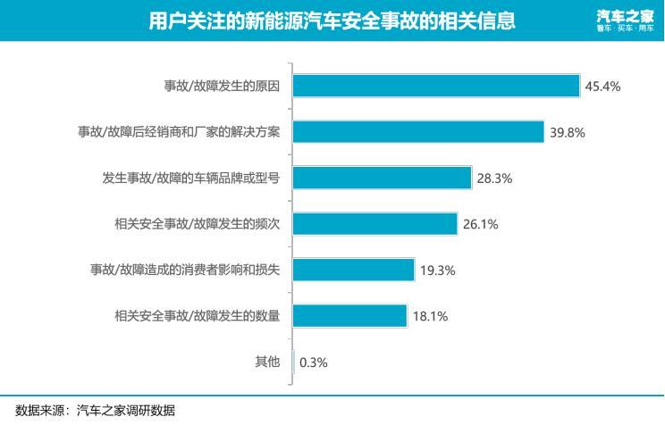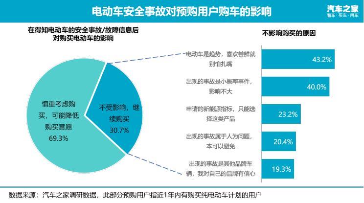 汽車之家調(diào)研數(shù)據(jù)證明,安全事故有可能對(duì)用戶選購電動(dòng)車產(chǎn)生較大的負(fù)面影響。在得知電動(dòng)車安全事故/故障的消息后,近7成用戶會(huì)更加慎重的去做出購車決策,并可能降低購買意愿。僅有3成用戶完全不受安全事故影響,會(huì)繼續(xù)購買電動(dòng)車。不受影響的用戶,主要基于嘗鮮及理性考慮事故概率出發(fā)而堅(jiān)持購買。盡管,美國國家公路交通安全管理局研究認(rèn)為,電動(dòng)汽車發(fā)生起火這類安全事故的概率要低于柴油和汽油發(fā)動(dòng)機(jī)車輛。我國消防應(yīng)急管理部門也表達(dá)了類似觀點(diǎn)。但源于對(duì)電動(dòng)車這一新品類的關(guān)注及對(duì)事故原因了解不深的恐懼,人們顯然對(duì)新能源車起火有更多的焦慮。畢竟,安全重于泰山,生命高于一切。