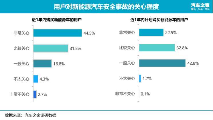 電動(dòng)車自燃等安全事故更加觸目驚心。相比汽油車來說,電動(dòng)車電池起火燃燒溫度高、速度快、撲救難度大,同時(shí)會(huì)釋放大量有毒氣體,因此事故的觸目驚心更易引發(fā)廣泛關(guān)注。汽車之家調(diào)研數(shù)據(jù)表明,超過7成的新能源車已購用戶對(duì)于安全事故的關(guān)心程度(指非常關(guān)心+比較關(guān)心)較高,擔(dān)憂自用車和自身出行的安全性。