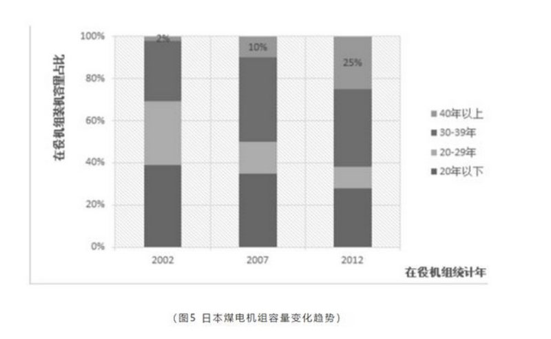 根據(jù)國內(nèi)某研究院提供的日本學(xué)術(shù)會議資料,截至2012年,日本近50%的煤電機組服役年限為30~39年,25%的煤電機組服役年限超過40年,僅有約1/3的機組服役年限不足20年,煤電機組平均服役年限為38年。日本自然資源相對匱乏,20世紀70年代初,大量廉價天然氣進入日本,同時核電技術(shù)快速發(fā)展,成本相對較低的氣電和核電的大規(guī)模開發(fā)成為日本煤電機組退役的主要原因??梢?,日本煤電機組服役年限也非設(shè)計壽命到期因素影響。日本煤電機組容量變化趨勢如圖5所示。