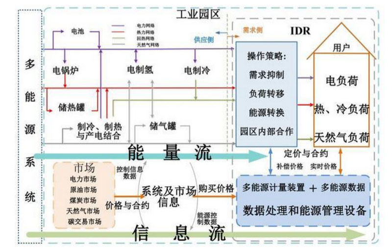 工業(yè)園區(qū)是復(fù)雜的能源系統(tǒng),包含多種能源形式,涉及多種能源的生產(chǎn)、傳輸和利用。工業(yè)園區(qū)能源的多樣性為多能源容量配置提出了更高的要求;同時,由于其負(fù)荷需求大、負(fù)荷特性復(fù)雜、不同能源的耦合與供電可靠性要求高,對需求側(cè)的運行調(diào)度帶來了新的挑戰(zhàn)。綜合需求響應(yīng)(integrated demand response,IDR)不僅可以解決工業(yè)園區(qū)中能源線路的擁塞問題,而且可以加強供需平衡、提高市場流動性、引導(dǎo)客戶改變能源需求,此外,還可以提高效率,減少對單一形式的能源的依賴。隨著涉及多種能源整合的智能城市發(fā)展,有必要分析工業(yè)園區(qū)中綜合需求響應(yīng)的特點,這不僅可以支持多能源系統(tǒng)和工業(yè)園區(qū)的發(fā)展,而且可以有效平衡供需。